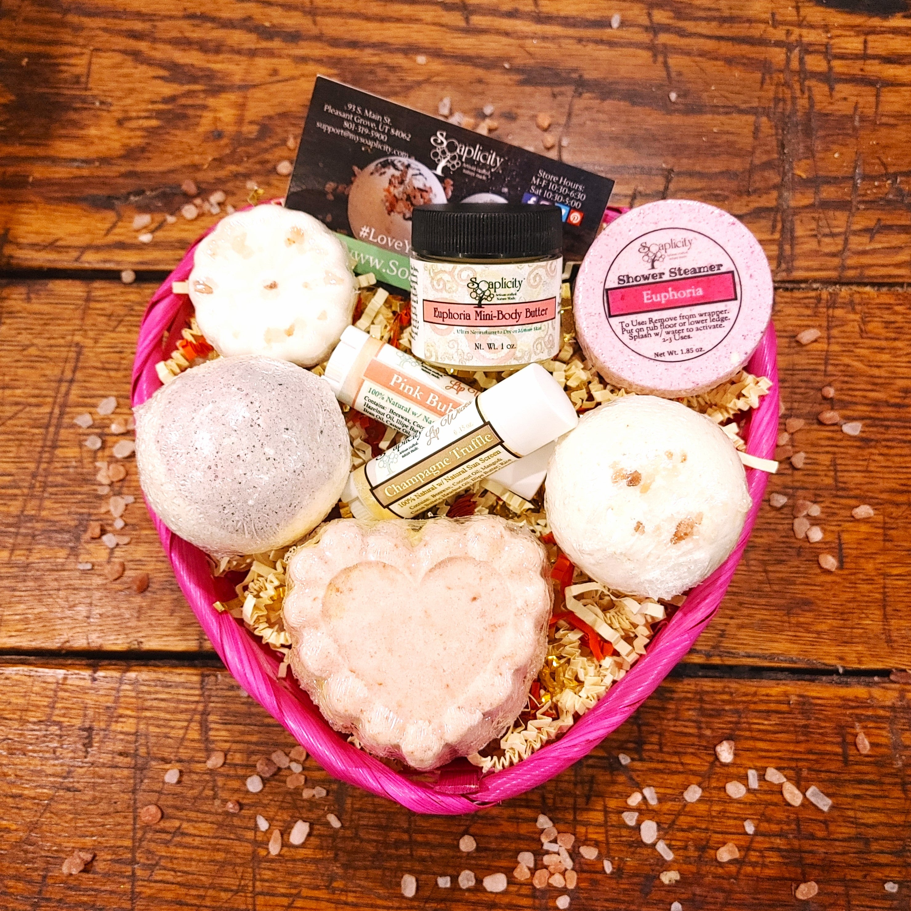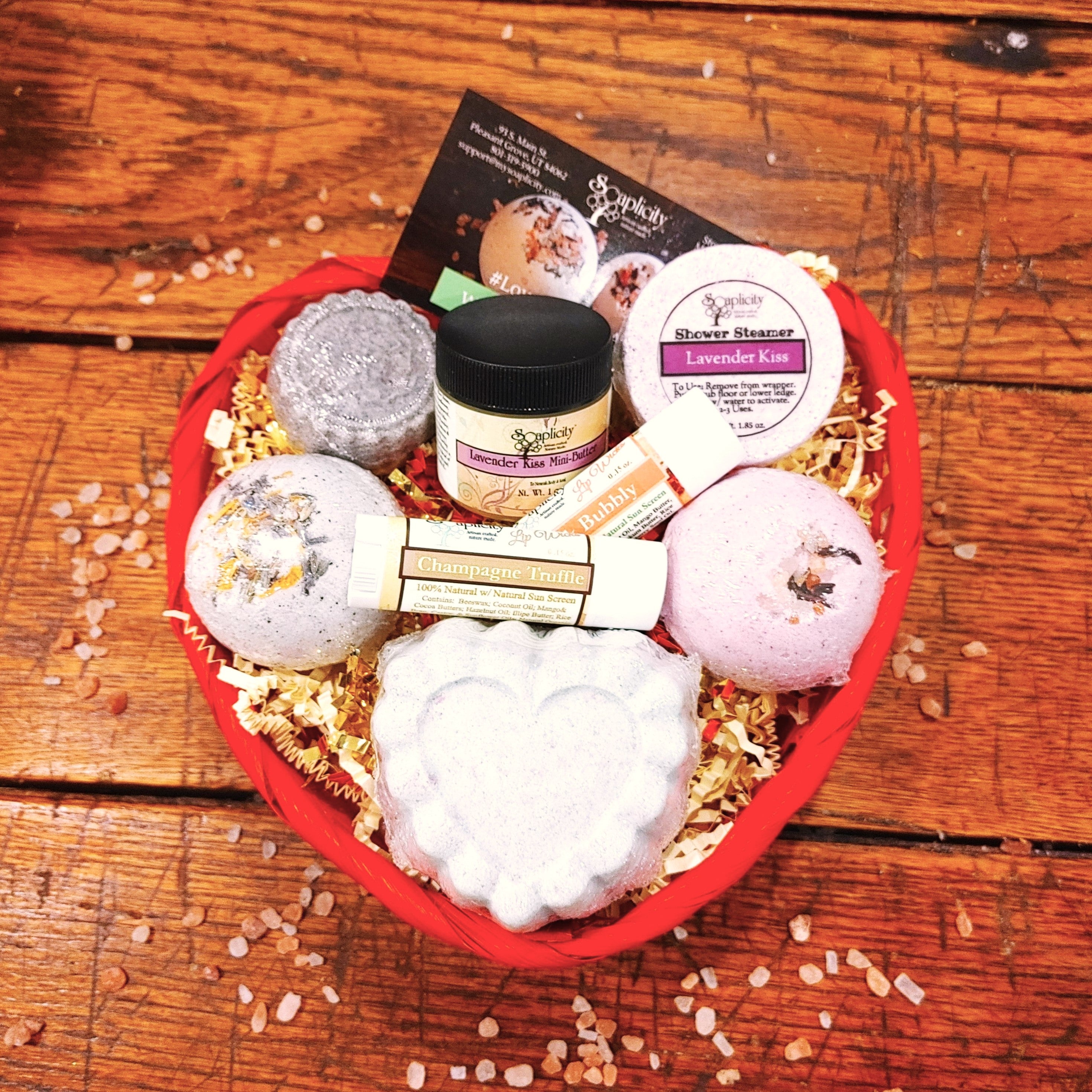 Each contains a little something for the shower, tub, body, and lips all wrapped up in a heart-shaped basket with our 100% biodegradable plastic wrap! Adorable and decadent, with products that don't sabotage weight goals and give months of skin-nourishing pleasure.